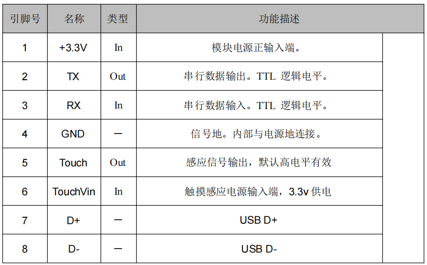 本指紋模塊還具備感應(yīng)手指功能,當(dāng)手指按壓到指紋采集面時,模塊 Touch 腳輸出高電平。