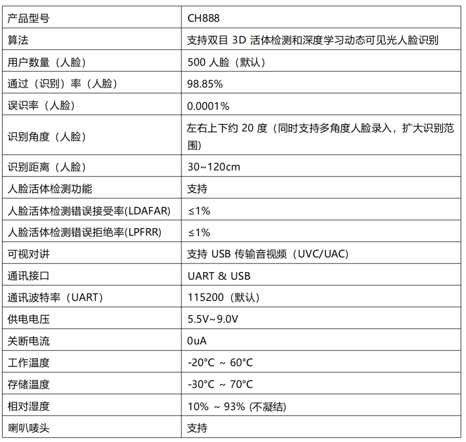 CH888 紅外+可見光雙目人臉識別算法模組